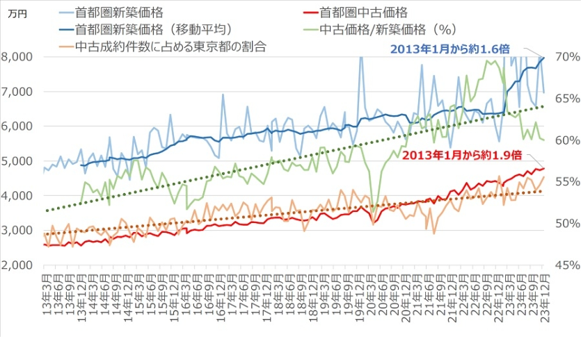 例えば近年の首都圏中古マンション成約価格は、2014年の平均2,727万円から2023年には4,575万円へと約1.6倍に高騰しており、築古でも資産価値が落ちにくい傾向が見られます。